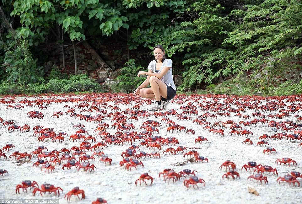 在澳大利亚的圣诞岛,生活着4300多万只螃蟹。在繁殖期时,由于螃蟹要前往海边生产,岛上随处可见这些密密麻麻的红色小生灵。