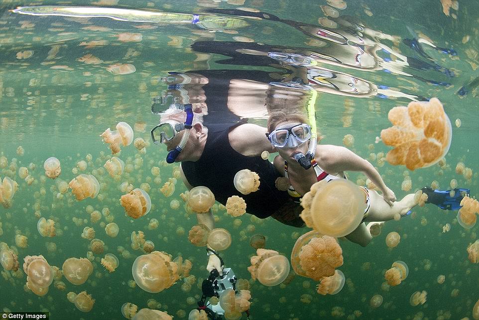 由于没有天敌,水母的刺也随着时间,进化消失,现在游客也能在水中和这些无刺水母相伴戏水,不用担心收到伤害。