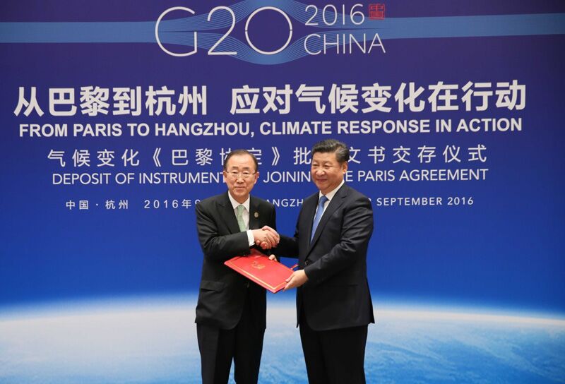 2016年9月3日,国家主席习近平同美国总统奥巴马、联合国秘书长潘基文在杭州共同出席气候变化《巴黎协定》批准文书交存仪式。这是习近平向潘基文交存中国气候变化《巴黎协定》批准文书。新华社记者 兰红光 摄
