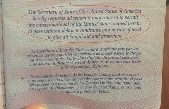 直译过来,意为:“美利坚合众国国务院特此请求允许持证美国公民/国民过境,不要延误办理或设置阻碍,并在需要时给予法律援助和保护。”以下两段为其法文和西班牙文的同义表述。