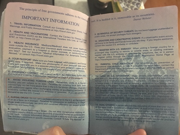 美国护照内页。第6页第6条写明:请记住,在国外时应遵守当地法律。即使是在不知情的情况下违反当地法律,也可能受到比在美国国内更严重的惩罚。(Avoid violating foreign laws. Remember, while in a foreign country, you are subject to its laws. Penalties for violating local laws, even unknowingly, can be more severe than in the U.S for similar offenses.)