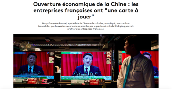 法国新闻广播电台网站2017年10月18日发表文章,题目为《中国保持经济开放,法国企业将有新机遇》,中国经济问题专家玛丽-弗朗索瓦丝·勒纳尔女士在文中指出,习近平在中共十九大报告中承诺中国经济将保持开放,这将为法国企业带来机遇。