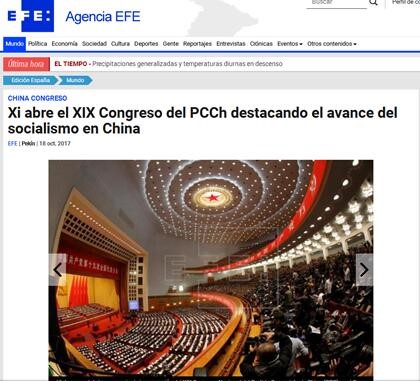 西班牙埃菲社10月18日在首页世界新闻头条位置,对十九大进行了报道。报道称,十九大开幕会上,习近平指出,“中国特色社会主义进入新时代”、“六千多万贫困人口稳定脱贫”。