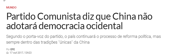 巴西EXAME网站17日援引埃菲社的文章说,中国共产党表示将不会照搬西方式民主。文章写道,中共十九大召开前夕,官方新闻发言人庹震表示,中国也不会照抄照搬别国模式。独特的文化传统,独特的历史命运,独特的基本国情,注定了中国必然要走适合自己特点的发展道路。