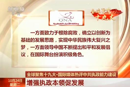卡塔尔通讯社在报道中盛赞中国共产党的执政本领,一方面致力于根除腐败,确立以创新为基础的发展思路,实现中华民族伟大复兴之梦,一方面领导中国不断提出和平和发展倡议,在国际舞台扮演积极角色。