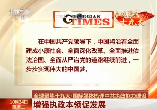 《格鲁吉亚时报》在其俄文官网刊文表示,在中国共产党领导下,中国将沿着全面建成小康社会、全面深化改革、全面推进依法治国、全面从严治党的道路继续前进,一步步实现伟大的中国梦。