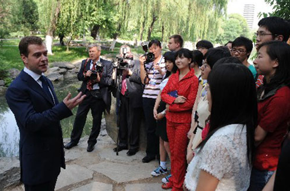 2008年5月24日,梅德韦杰夫在未名湖畔和北大学生们交谈。在北大的演讲中,梅德韦杰夫说,论语的第一句话就是有名的“学而时习之不亦说乎”。他表示,俄中两国应积极开展文化教育领域交流。