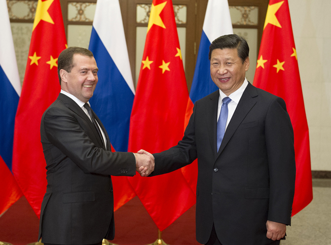 2013年3月,习近平主席作为国家元首的首次出访即选择俄罗斯。习近平在莫斯科会见梅德韦杰夫时表示,近年来,中俄关系经受住国际风云变幻考验,取得长足发展。面对国际金融危机对我们两国的冲击,中俄密切配合、携手应对。梅德韦杰夫表示,在国际金融危机面前,俄中携手合作,为国际社会树立了榜样。