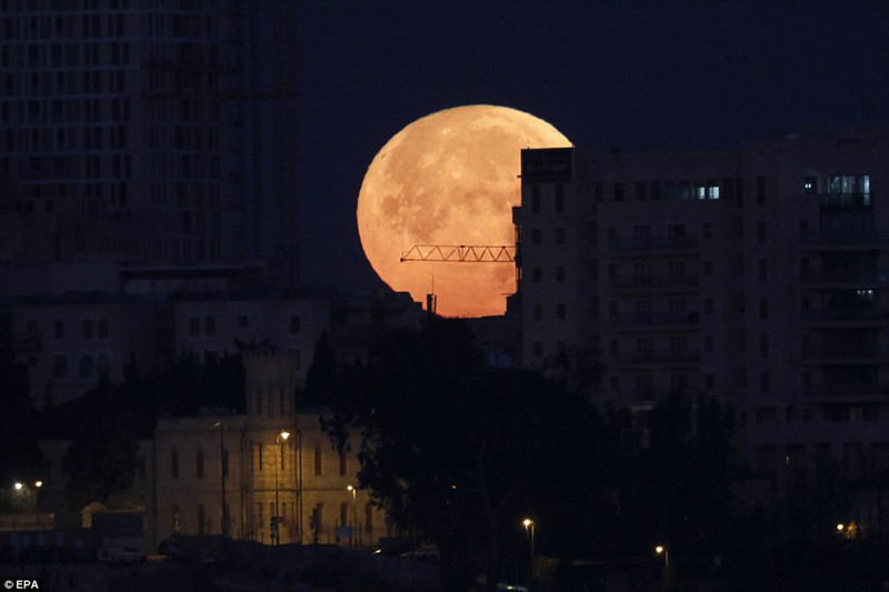 凌晨耶路撒冷上空呈橘色的超级蓝血月。