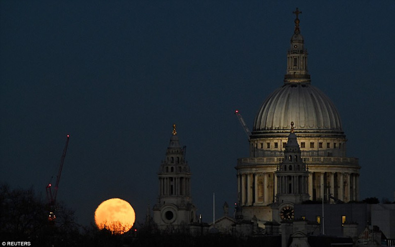 布朗先生说道,对于想要在英国欣赏月食的人来说,他们可能要失望而归了。英国当天不会出现月食,甚至连月偏食都看不见。图为伦敦上空的月亮,前面就是圣保罗大教堂。