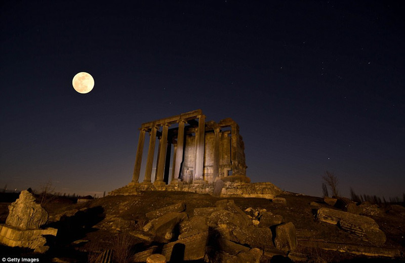 31日晚土耳其境内库塔雅省埃扎诺伊古城上空的超级蓝血月。