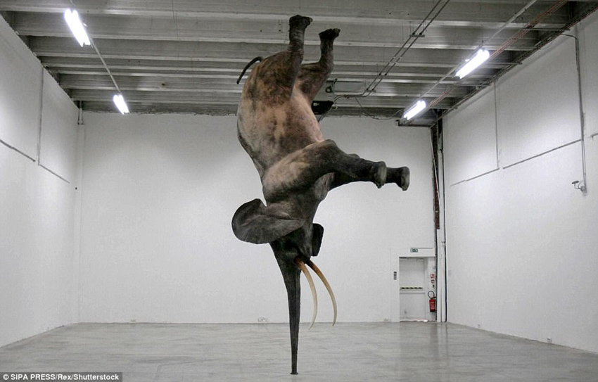 2008年,在巴黎东京的“超级穹顶”展览上,当代艺术家丹尼尔·菲尔曼精心设计的大象雕塑,庞大的身躯在鼻子上摇摇欲坠。