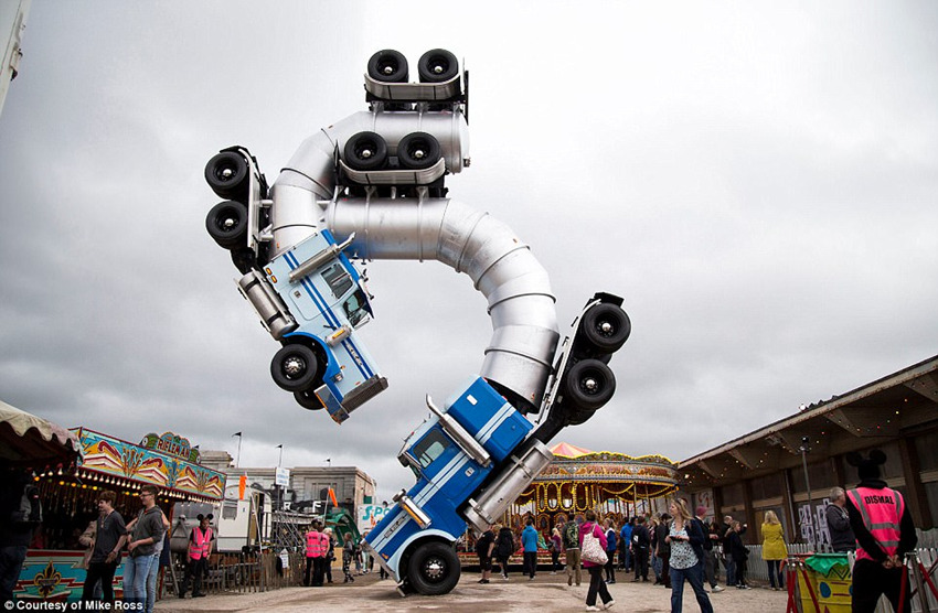 美国雕塑家迈克·罗斯创作的巨型卡车雕塑是由两辆废弃的油罐车建造的。