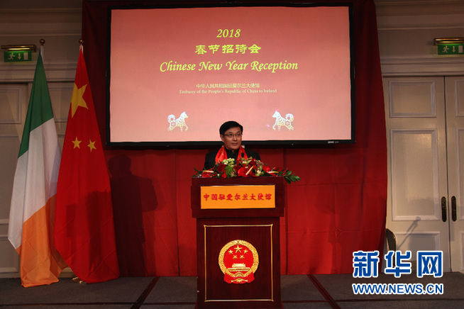 岳晓勇大使在致辞中表示,2018年春节是中国共产党十九大胜利召开后的第一个春节,也是中国人民在以习近平同志为核心的党中央领导下迈入中国特色社会主义新时代的第一个春节。值此新春佳节来临之际,中国驻爱使馆向长期致力于中爱友好的的各界人士表示诚挚的问候和新春祝福。2017年,中爱关系取得了令人欣喜的进展。双方高层互访保持频繁;两国贸易和投资大幅增长,双边贸易同比增长36.7%,爱尔兰对华投资同比增长3.5倍;两国在教育、科技、文化等领域的交流与合作也迈上了新台阶,爱尔兰政府已决定将汉语纳入该国的高考课程。