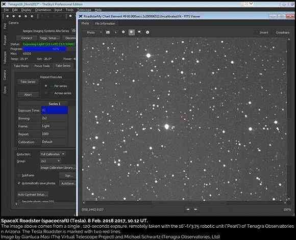 这两位天文学家一位是 Virtual Telescope Project 项目的吉安鲁卡 · 马希(Gianluca Masi),另一位是 Tenagra 天文台创始人迈克尔 · 施瓦茨(Michael Schwartz)。利用美宇航局喷气推进实验室的数据,将望远镜导向特斯拉电动敞篷跑车的方向,最终捕捉到其历史性漫游的画面。