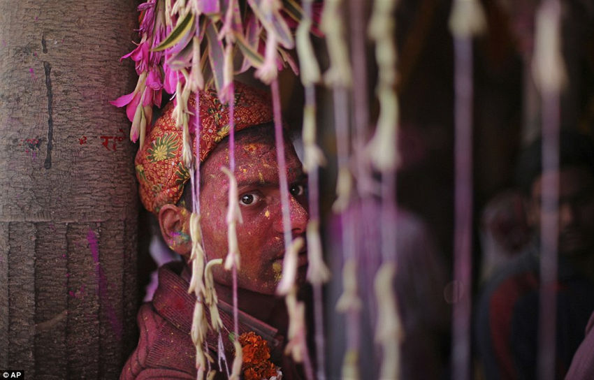 一个印度教信徒脸上涂满了颜色,在狂欢开始前在神庙里休息。