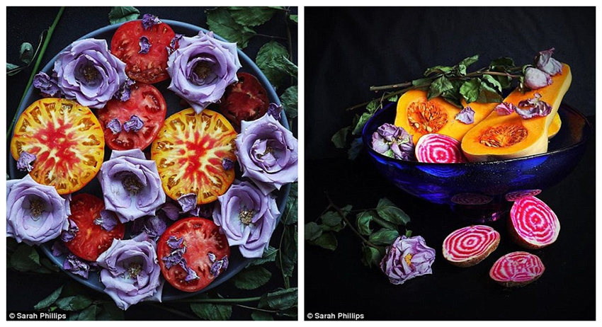 莎拉倾向于挑选色彩鲜艳的水果和蔬菜,也会加入花的元素。