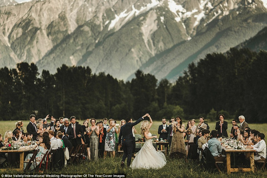加拿大迈克谷的田野里跳舞的一对新人。