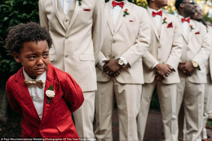 感人的镜头:一个小男孩看到他的新娘妈妈走在过道上,流下了眼泪。
