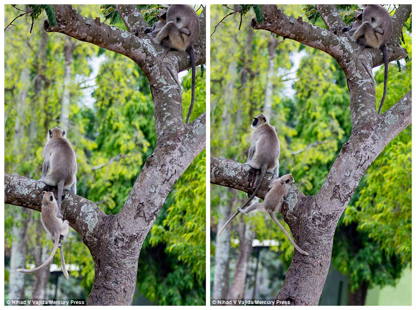 玩累了顺着妈妈的尾巴爬上来。