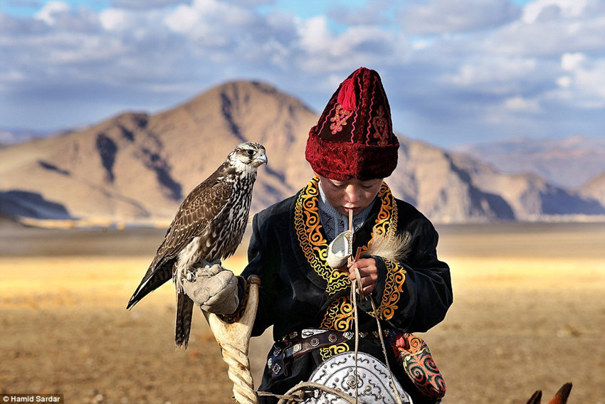 在蒙古崎岖的荒野里,一个男孩手持着一只猎鹰。