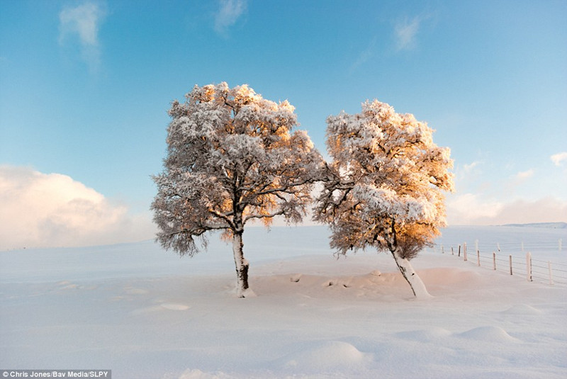 在苏格兰北部索色兰郡的罗加尔特,克里斯·琼斯(Chris Jones)拍下了两颗相依在一起的树。日落时分,被白雪覆盖的两棵树闪耀着金色的光芒。这幅作品在冬日景象小组中获得了第一名的成绩。