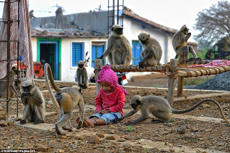 图中Samarth Bangari和叶猴们在自家院子里玩耍着,有一只叶猴正拉扯着他的衣服。
