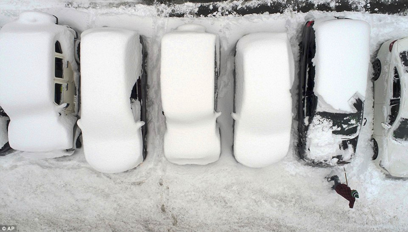 马萨诸塞州西部的伯克夏在周三晚上遭到了暴风雪的侵蚀,积雪厚达12至32英寸(约0.3米至0.8米)。图为当地被积雪覆盖的汽车。