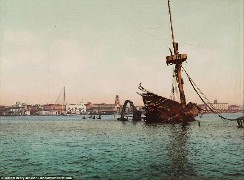 这张照片经过彩色处理,古巴哈瓦那港,美国的“缅因号”军舰的残骸。