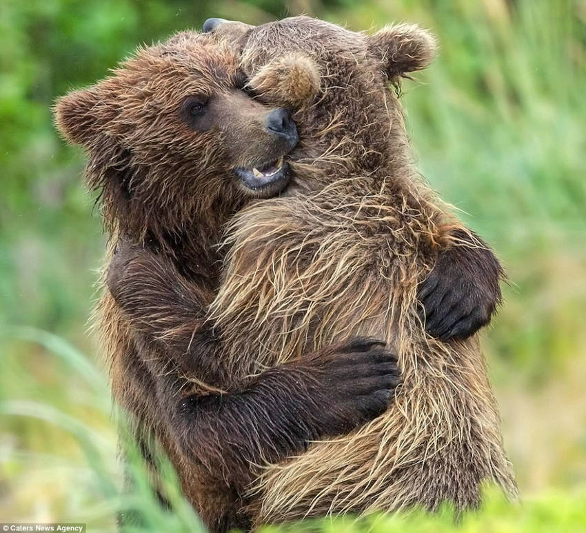 阿拉斯加的克拉克湖,紧紧相拥的熊妈妈与熊宝贝。