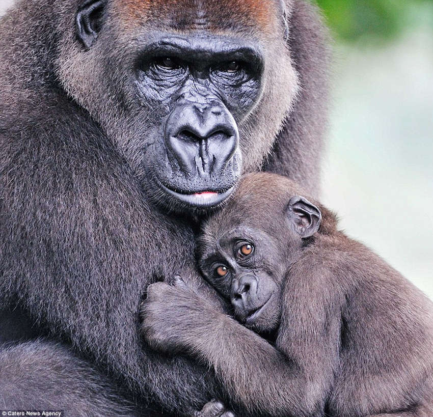 喀麦隆的利姆贝野生动物中心,大猩猩靠在妈妈怀里。