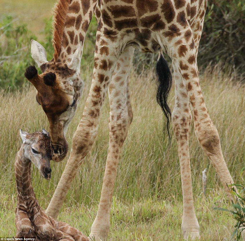 南非,刚出生不久的小长颈鹿享受妈妈的爱抚。