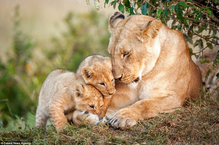 这两只小狮子在妈妈跟前争宠呢。