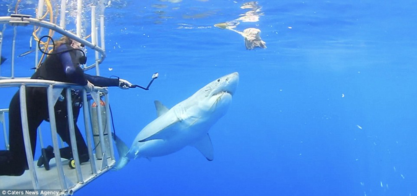 就在它撞到笼子之前,鲨鱼抓到了一大块肉饵。