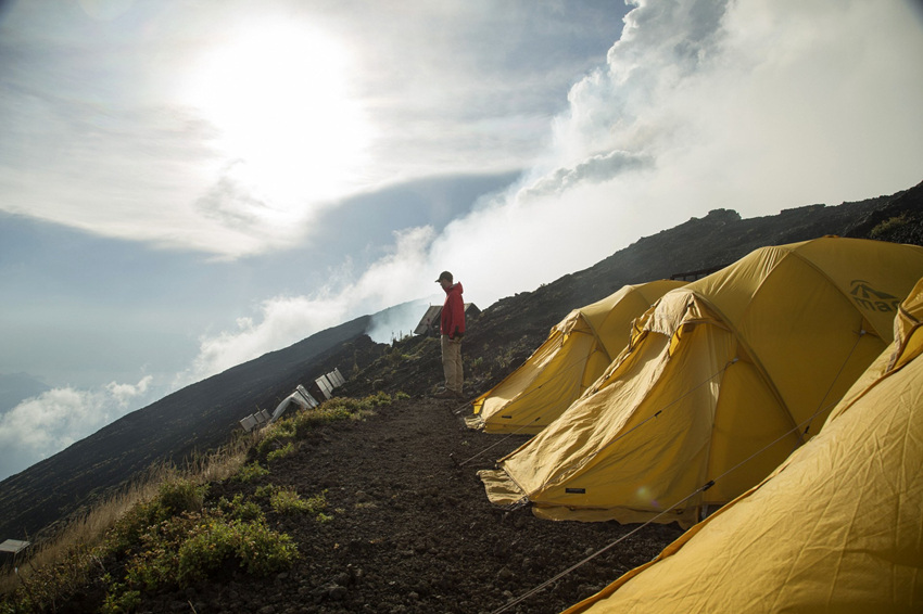 克里斯·金站在营地附近。他们在火山口的二级阶梯上度过了几个晚上,下一级阶梯就是熔岩湖的边缘。