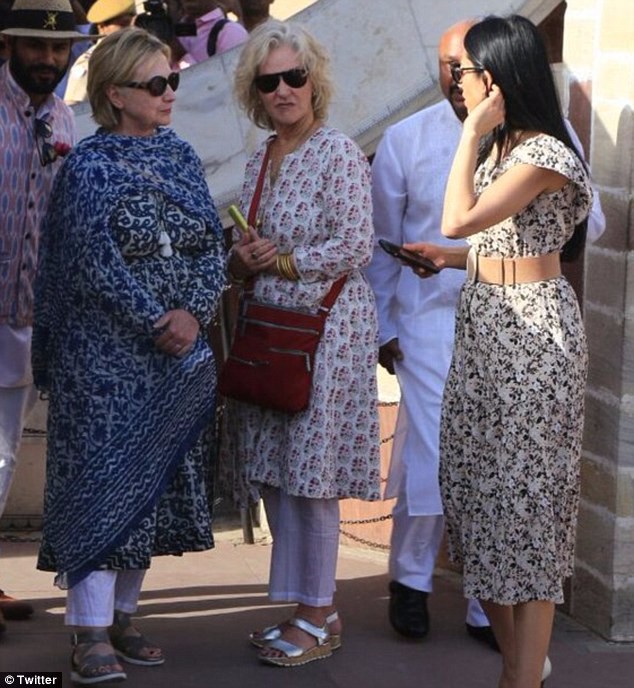 人民网讯 据每日邮报报道,15日,希拉里出现在印度斋浦尔时穿着一件特制的印度传统服饰,但是看起来像是特制的衣服,右边袖子非常宽大,报道称,希拉里以此来遮挡自己受伤的手腕。据称她两天前在酒店浴缸中滑倒,手腕受伤。15日,希拉里在胡玛·阿贝丁的陪同下参观了印度的历史古迹。