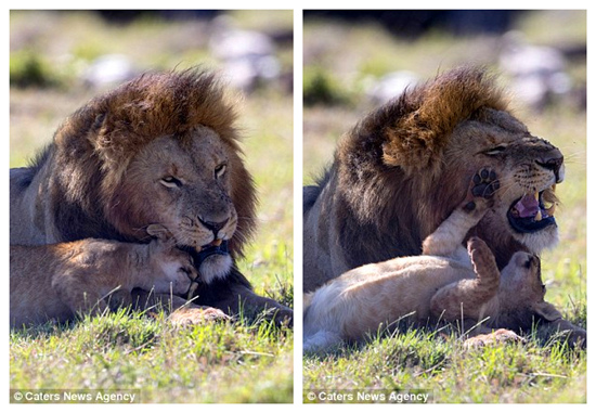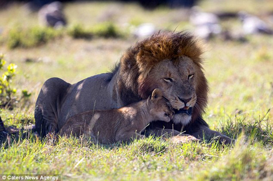 这种画面可不多见,肯尼亚马赛玛拉动物保护区,一只刚刚占领狮群并杀死其他幼崽的成年雄狮,抱着一只小狮子玩耍。这只雄狮赶走了小狮子的父亲后,与他依偎在一起嬉戏打闹。这只好奇的幼崽还把爪子伸到雄狮嘴里,玩耍它的大獠牙。