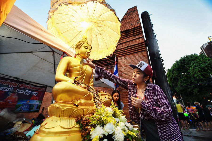 在泰国北部,僧人拿着小袋沙子赤脚来到寺庙,意为着将过去一年中带走的灰尘还回去。这些沙子之后会被堆成小佛塔,并用旗子装饰,是一种礼佛仪式。