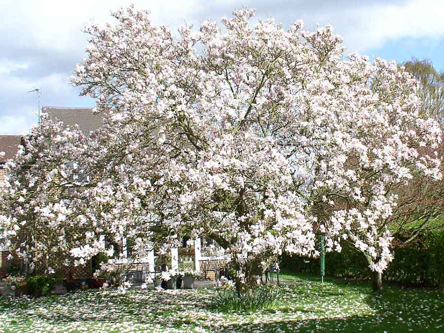 春天的欢乐:漂亮的诺丁汉花园被白色和粉红色的玉兰花瓣所覆盖。
