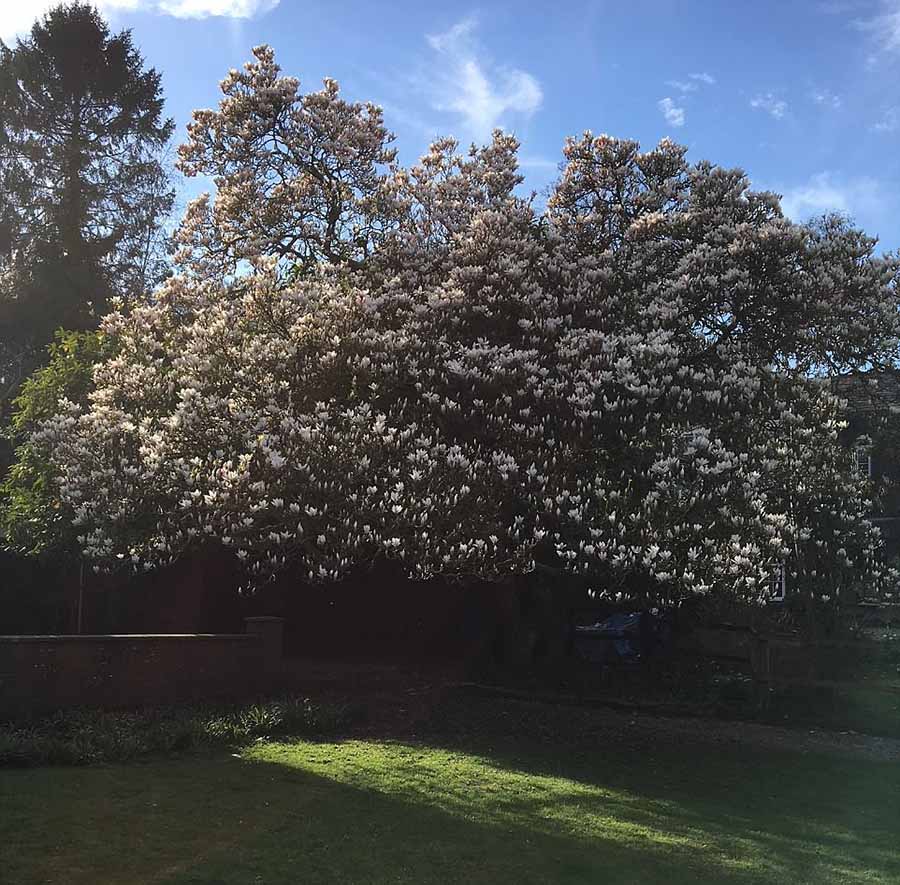 漂亮的粉红色和白色花朵:在一家私人后花园里的一棵华丽的玉兰花树。