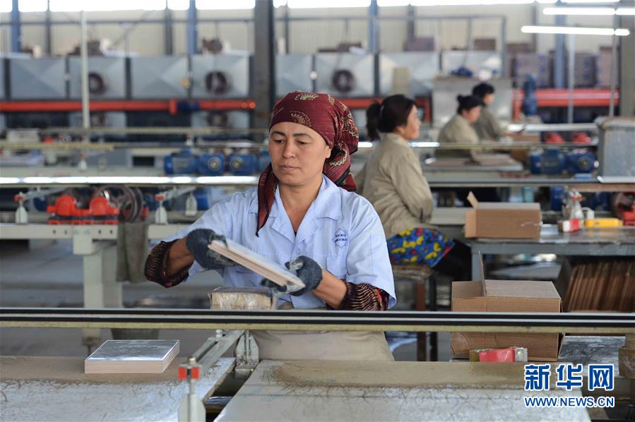 这是2017年5月1日,在位于乌兹别克斯坦锡尔河州的鹏盛工业园区,工人在瓷砖生产车间工作。