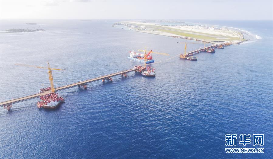 这是2017年7月6日俯拍的马尔代夫中马友谊大桥建设现场。中马友谊大桥于2016年初正式动工,是中马共建“一带一路”的重要合作项目。作为马尔代夫有史以来第一座大桥,同时也是印度洋上第一座跨海大桥,中马友谊大桥连通马尔代夫首都马累和机场岛,由桥梁、填海路堤及道路等组成,使用寿命100年。新华社发