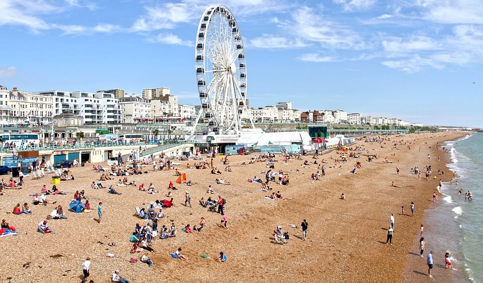 一个阳光明媚的日子总是能带动游客前往位于英格兰南海岸的世界着名的布莱顿海滩(Brighton beach),该海滩获得了2018年的蓝旗称号。