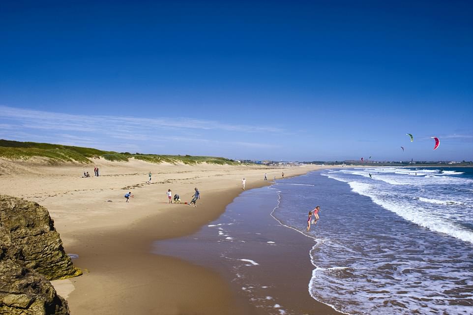 南泰恩赛德的Sandhaven海滩,英格兰东北地区六个被授予蓝旗的海滩之一。孩子们在水中玩耍,而其他人则在海滩上放风筝。