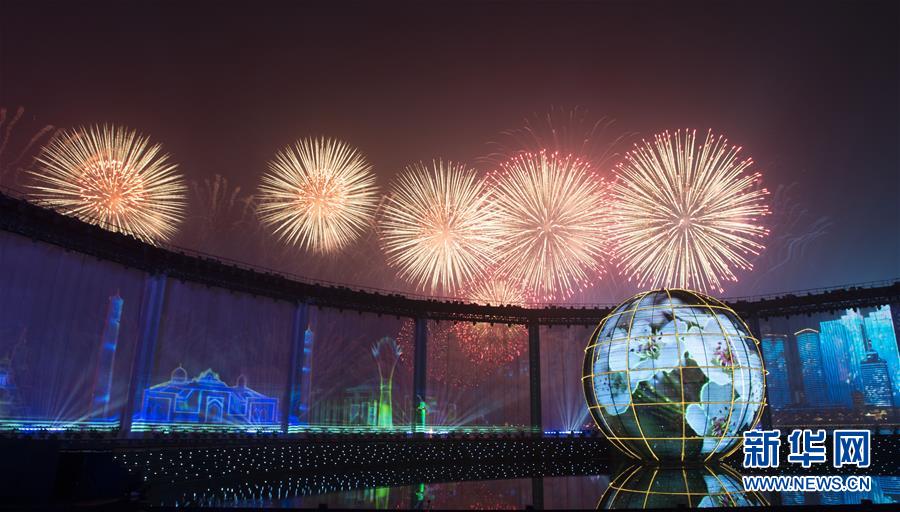 6月9日至10日,上海合作组织青岛峰会在山东青岛召开。这是9日晚在青岛举行的《有朋自远方来》灯光焰火艺术表演。 新华社记者李学仁摄