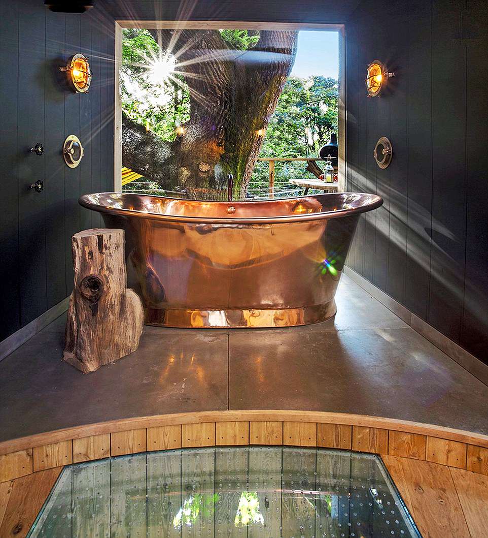 树屋配备了一个双层豪华的铜浴缸,在此还能直接享有林地的美景。
