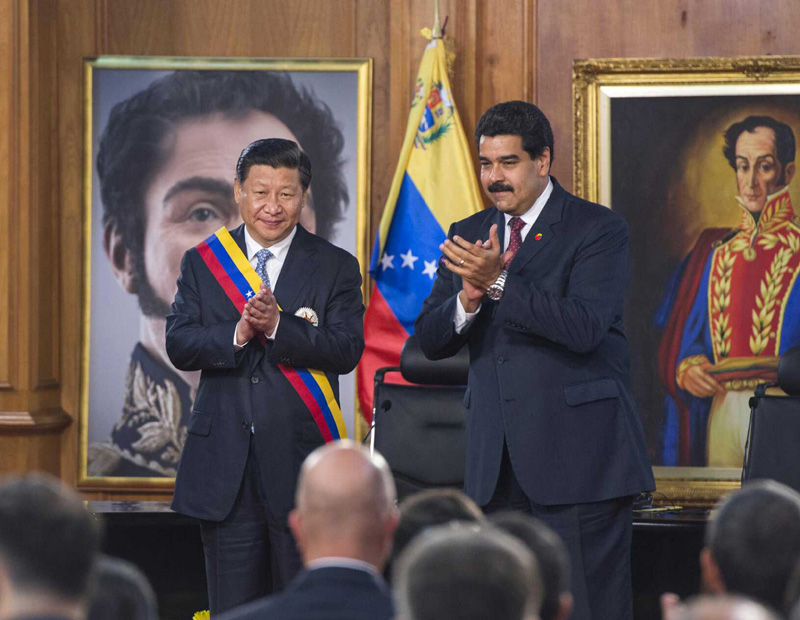 2014年7月20日,国家主席习近平在加拉加斯接受委内瑞拉总统马杜罗代表委内瑞拉政府授予的“解放者”勋章。