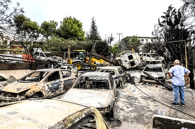7月24日,在希腊首都雅典附近的马蒂小镇,一名男子查看焚毁的汽车。
