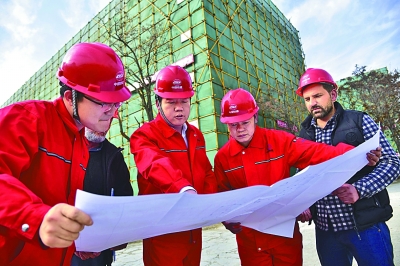 2月6日,在阿富汗首都喀布尔的建筑工地上,中铁十四局集团海外工程分公司驻中亚办事处党支部书记王闯(右三)就援阿国家职业技术学院项目与同事交流。新华社发