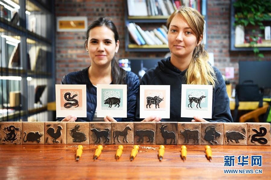 9月17日,俄罗斯列宾美术学院学生阿纳斯塔西娅(左)和塔季扬娜展示她们雕刻印制的《十二生肖》木版画及藏书票。 近日,俄罗斯列宾美术学院三名大学生来到位于甘肃省兰州市的读者出版集团“读者晋林工作室”,开展为期一个月的文化交流活动。三名学生通过尝试雕刻《十二生肖》木版画、印制藏书票、创作《盘古开天辟地》手工书等活动,感悟学习中国文化。据了解,这是俄罗斯列宾美术学院第二年派学生到“读者晋林工作室”学习交流。 新华社记者 范培珅 摄